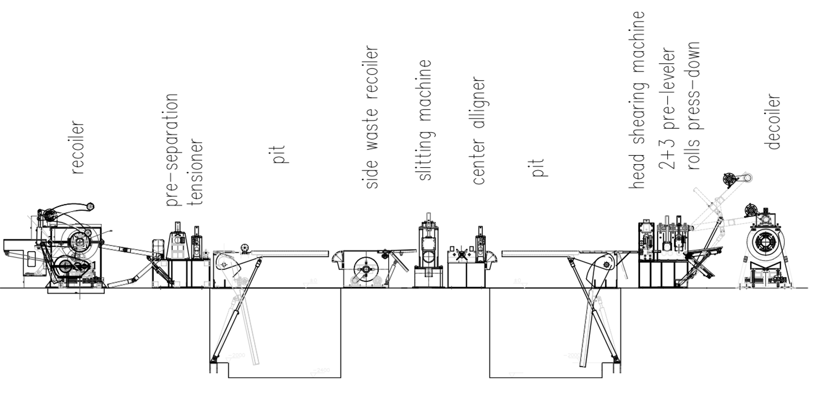 Rebobinador com carro de bobina de carga - Pré-separador e tensor - Poço - Rebobinador de resíduos - Máquina de corte e alinhador central - Poço - Máquina de corte e nivelador - Desbobinador com carro de bobina de carga