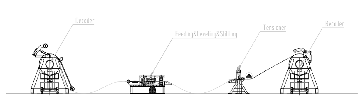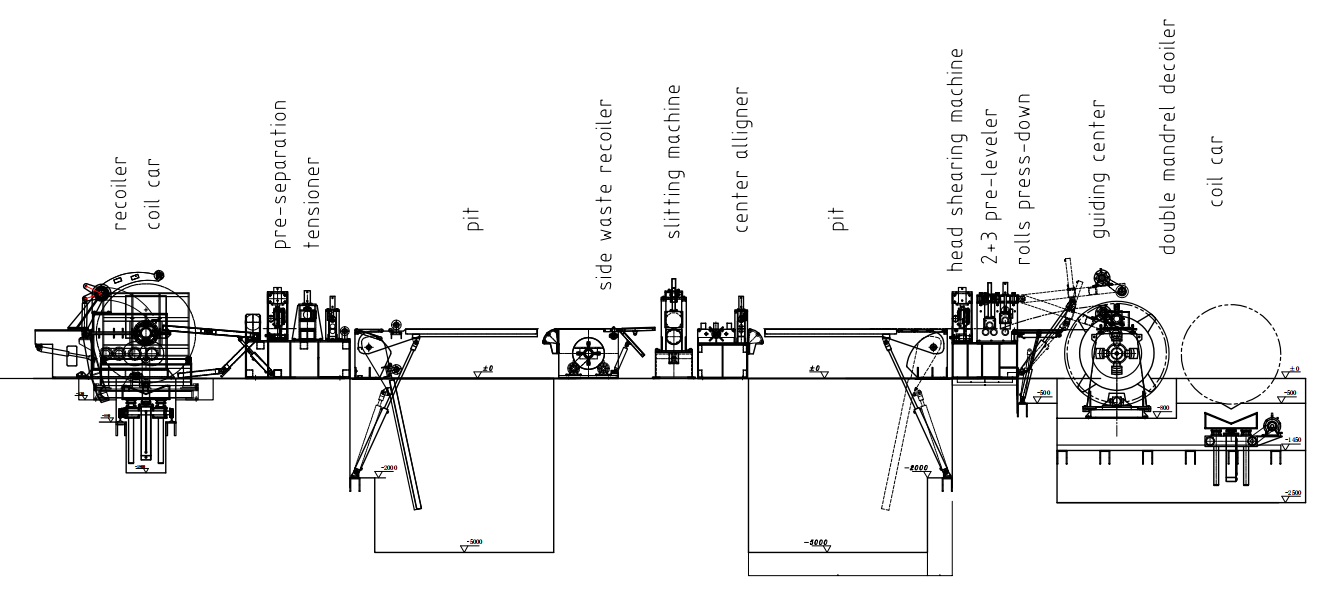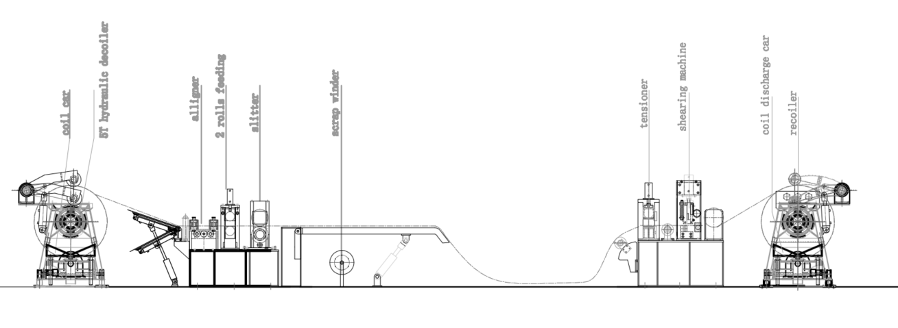 Desbobinador com carro de bobina de carga - Alinhador central, alimentação e corte - Rebobinador de sucata - Placa de transporte - Tensor, cisalhamento e pré-separador - Rebobinador com carro de bobina de carga