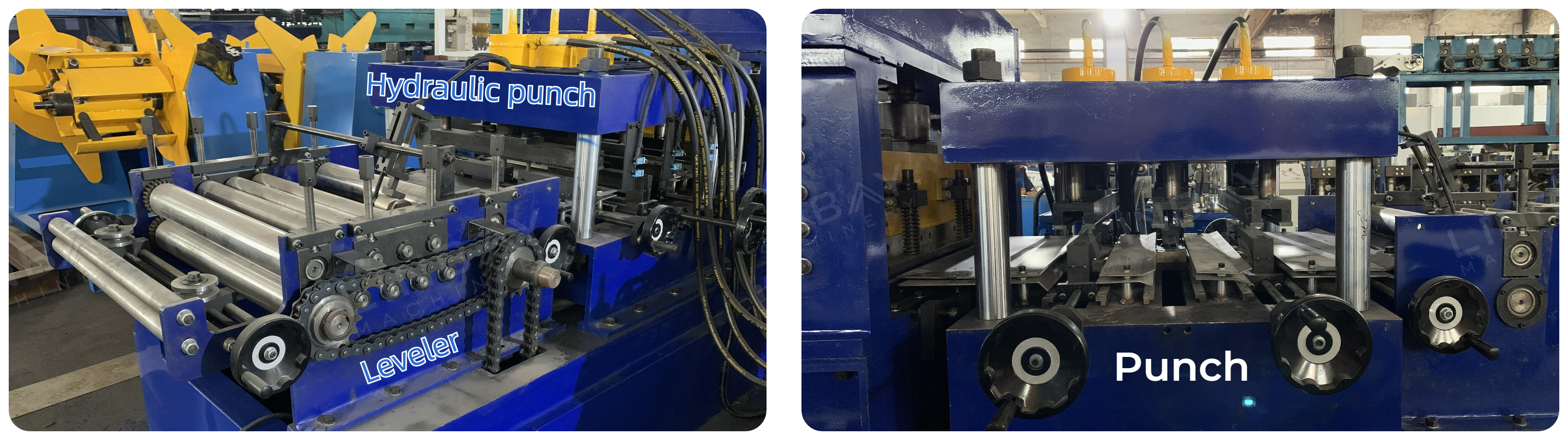 Leveler, punching machine and cutting machine are integrated with the roll forming machine, which is a very cost-effective design.