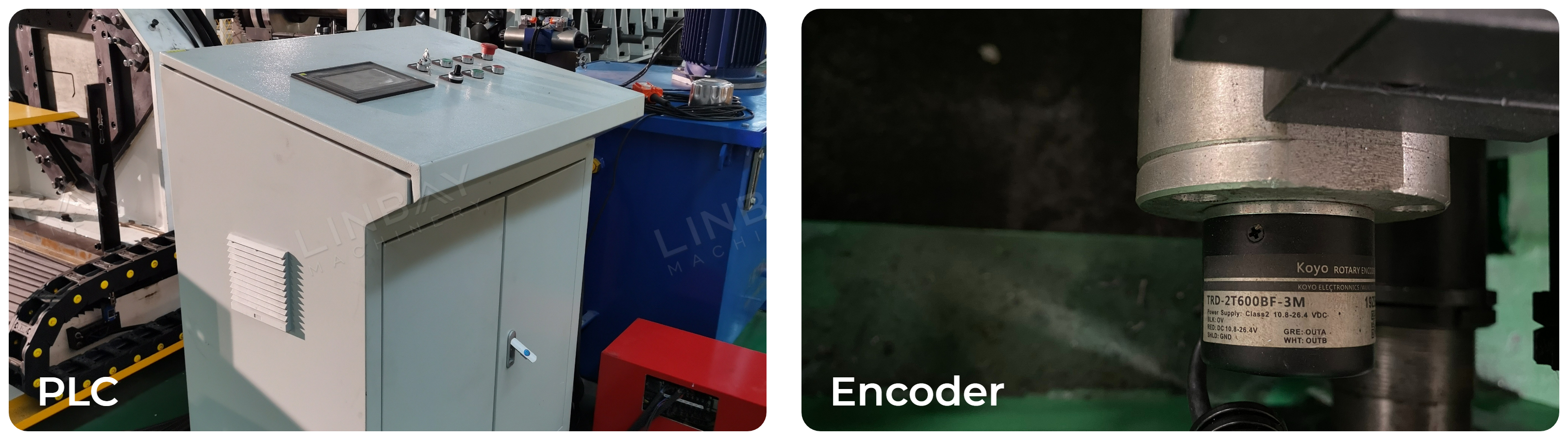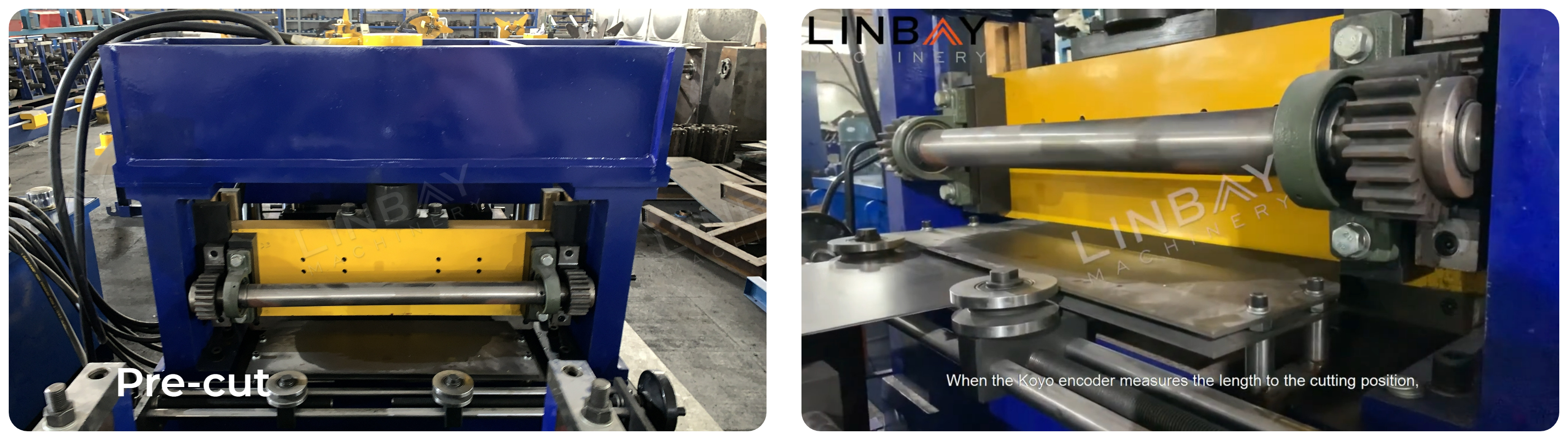 Workers can control the machine through the PLC screen, adjusting production speed, setting production dimensions, and cutting lengths, etc. An encoder is integrated into the production line, converting sensed steel coil length into electrical signals relayed to the PLC control panel. This allows our machine to maintain cutting precision within 1mm, guaranteeing high-quality products and minimizing material waste due to cutting errors.