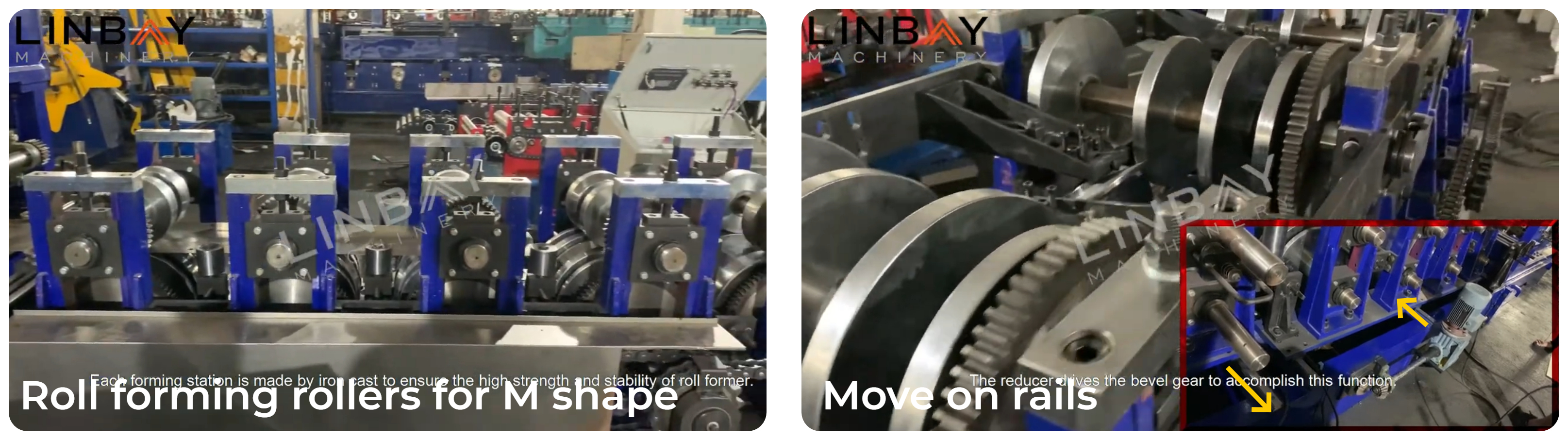 The roll forming machine features a cast-iron structure and chain driving system. The cast-iron structure is a solid piece of iron, ensuring sturdiness and stability. This machine is capable of producing C, Z, and Sigma purlins. The first four rollers are used for Sigma shape, and they are raised when forming C or Z shapes. Additionally, by manually rotating 2-3 forming stations by 180°, you can switch between producing C and Z purlins. The forming stations on one side of the machine move on rails to produce purlins of different widths. It's important to note that, upon request, we can also manufacture purlin machines that vary in both height and bottom width simultaneously.