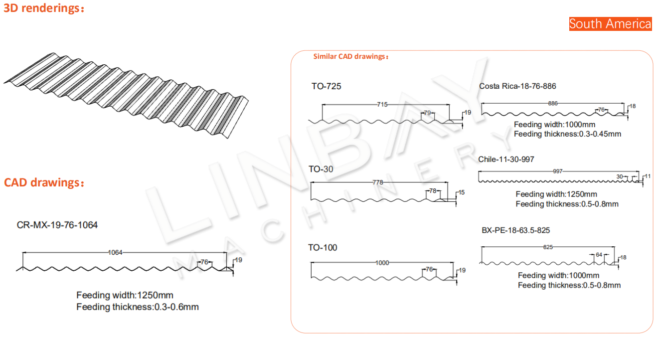 Las conformadoras de chapas tiene una amplia gama de perfiles de placas metálicas. Incluye teja trapezoidal, lámina sinusoisal, lámina galvateja, lámina losacero, standing seam panel, K span panel and cumbreras. Sus productos se utilizan ampliamente en las chapas y los sistemas de paredes de los edificios industriales y residenciales.