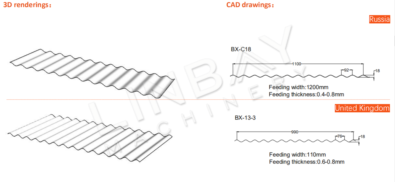 El espesor procesable normal de la conformadora de lámina sinusoidal es 0.2- 0.8mm, las normas o especificaciones más amplias utilizadas en el mercado internacional son Gauge 26 (0.45- 0.5 mm), las materias primas son Aluminio, PPGI, Acero galvanizado, Galvalum etc. Confirmaremos la contratación de la roladora según sus perfiles.