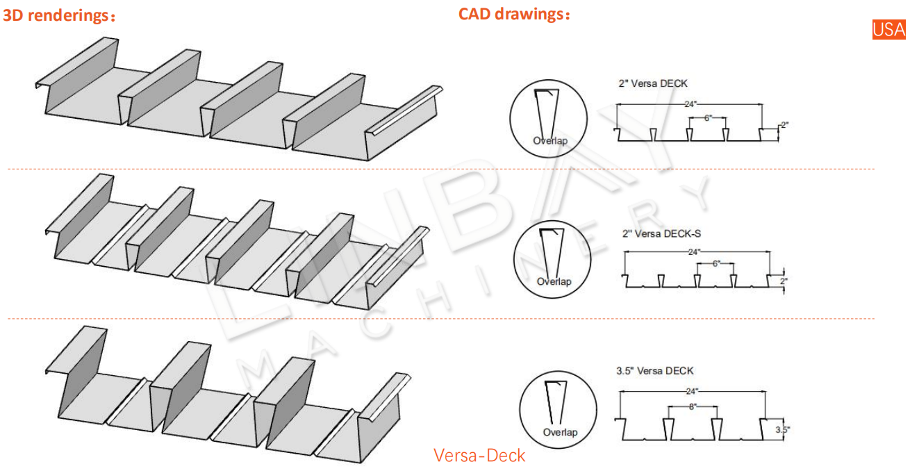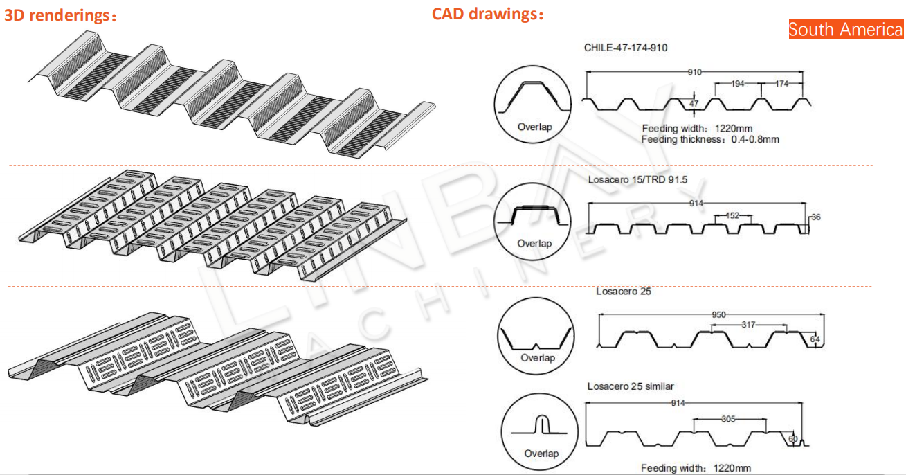 Las conformadoras de chapas tinene una amplia gama de perfiles de placas metálicas. Incluye teja trapezoidal, lámina sinusoisal, lámina galvateja, lámina losacero, standing seam panel, K span panel and cumbreras. Sus productos se utilizan ampliamente en las chapas y los sistemas de paredes de los edificios industriales y residenciales. Según sus dibujos, nuestras perfiladora de lámina losacero pueden producir cubiertas de piso, techos, plantillas y vigacero (más popular en Perú).