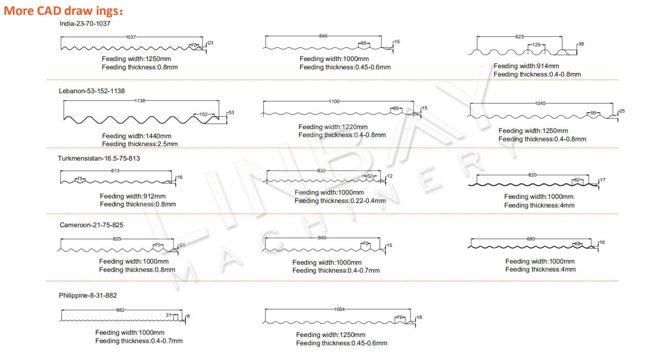 The normal machinable thickness range of our roof panel roll forming machine is 0.2mm-0.8mm, the standard or more used in international market is Gauge 26 (0.45-0.5mm), working raw material is Aluminum, PPGI, Galvanized steel, Galvalume steel etc. We confirm machine’s configuration according to your drawing, specially the pitch and height of each wave. Linbay Machinery is always your best choice of roof panel roll forming machine.