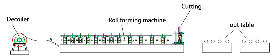 Al principio de la línea se encuentra una desbobinador hidráulica con capacidad para 5 toneladas. Está equipada con un brazo de presión para garantizar la seguridad de los trabajadores. Cuando la bobina de acero se coloca en el desbobinador pero aún no ha ingresado a la conformadora, existe la posibilidad de que la bobina se desplace y cause lesiones a los trabajadores. El brazo de presión puede mantener la bobina en su lugar y evitar que se desplace. Esta sección de la desbobinador consta de tres partes: la desbobinador hidráulica, el grupo hidráulico y el armario eléctrico.